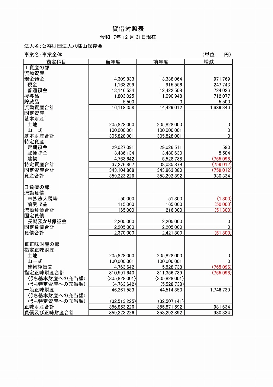 公益財団法人八幡山保存会の理事会が2月21日に開催、3月7日に評議員会が開催され、昨年度(令和7年度)事業報告と決算報告がなされ、承認されましたので、ここに決算書を掲示(公告)致します。